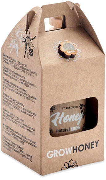 Vadvirágméz üvegben (50 g) fából készült mézcsurgatóval. Kraftpapír dobozban. Méhlegelő virágmagokkal együtt. EU-ban készült.