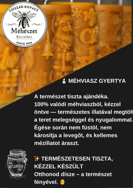 A természet tiszta ajándéka. 100% valódi méhviaszból, kézzel öntve - természetes illatával megtölti a teret melegséggel és nyugalommal. Égése során nem füstöl, nem károsítja a levegőt és kellemes mézillatot áraszt. Természetesen tiszta, kézzel készült. Otthonod dísze a természet fényével.