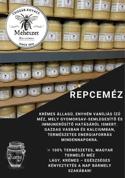 Lágy, krémes – egészséges kényeztetés a nap bármely szakában! A repceméz az egyik legmagasabb szőlőcukor tartalmú méz, ennek köszönhetően pedig hamar kristályosodik. Pergetés után 10–14 napon belül. Színe a hófehértől a halvány sárgáig terjed. Repceméz hatása az emberi szervezetre